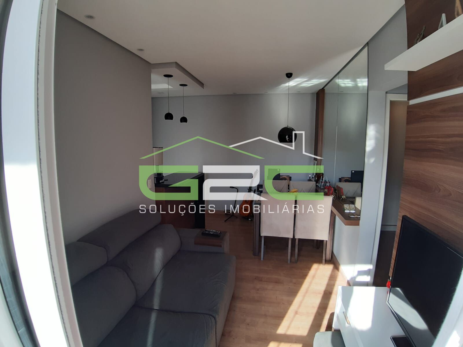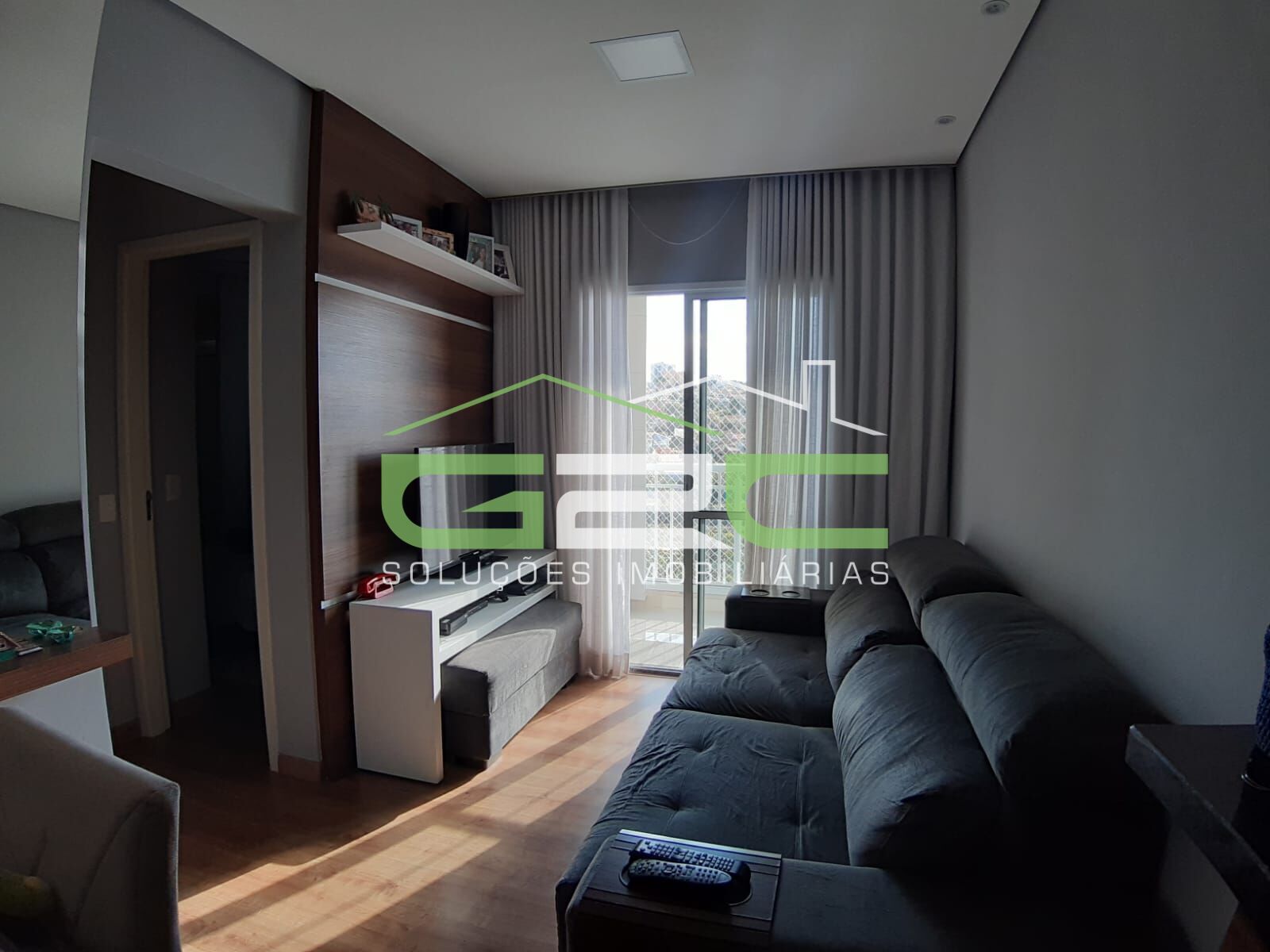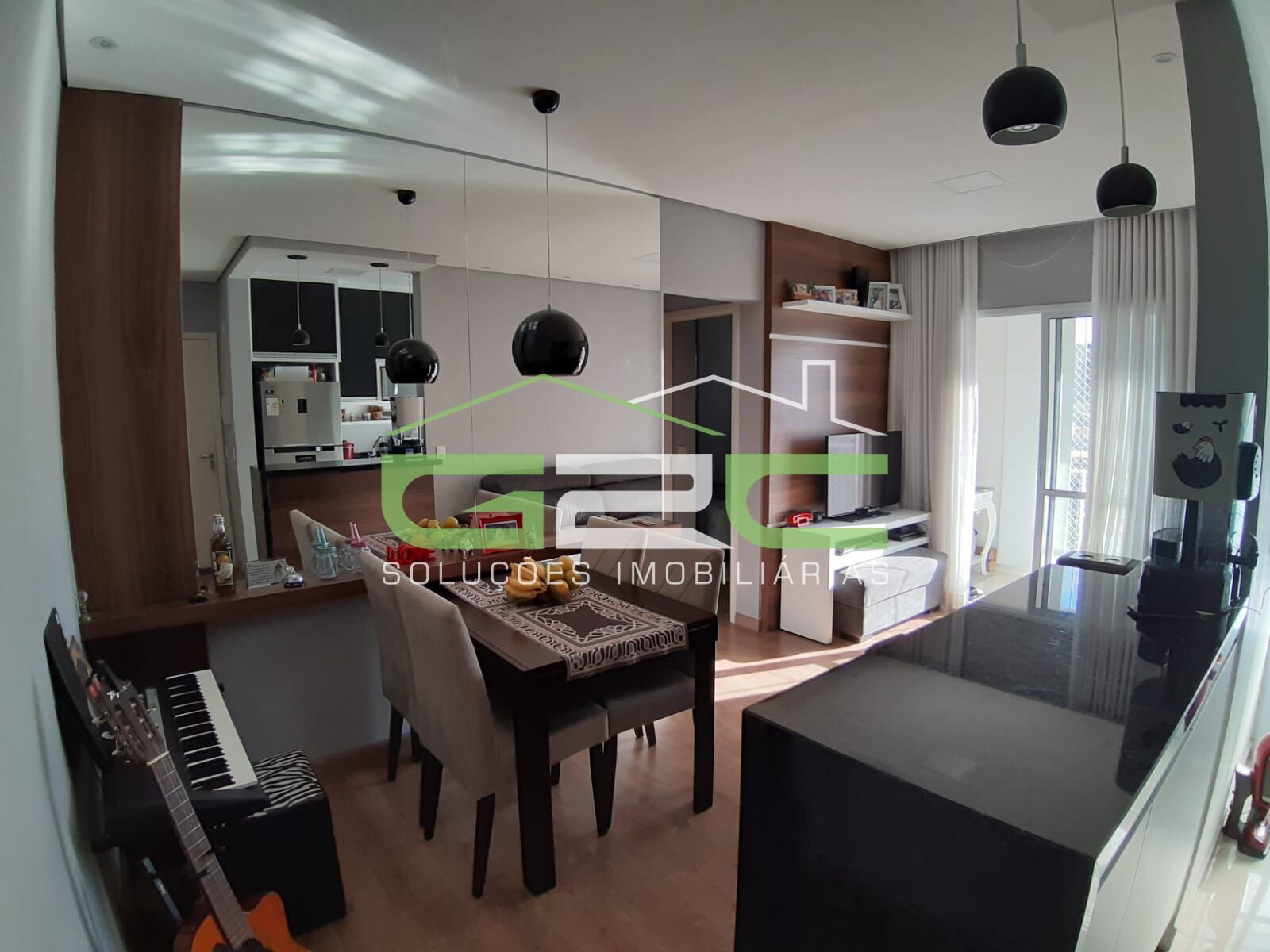 Apartamento com 2 dormitórios com persianas, sala de estar e jantar integradas já com lustres, varanda fechada com vidro pivotante e tela de proteção instalada, cozinha americana com armários planejados, cooktop, lavanderia com porta em vidro separando o ambiente, banheiro com armário planejado, box em vidro e espelho. Toda a área intima do apartamento com piso laminado.