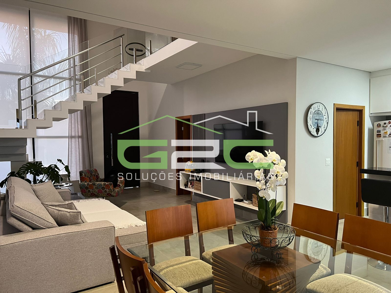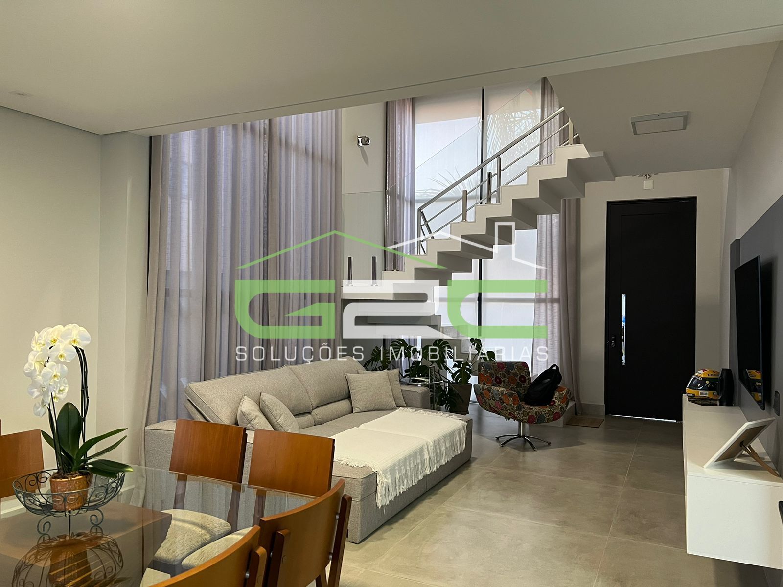 Piso Térreo possui um belíssimo espaço em conceito aberto todo integrado com pé direito duplo, com ar condicionado e cortinas, sala de estar, jantar, lavabo, cozinha planejada, lavanderia e despensa.