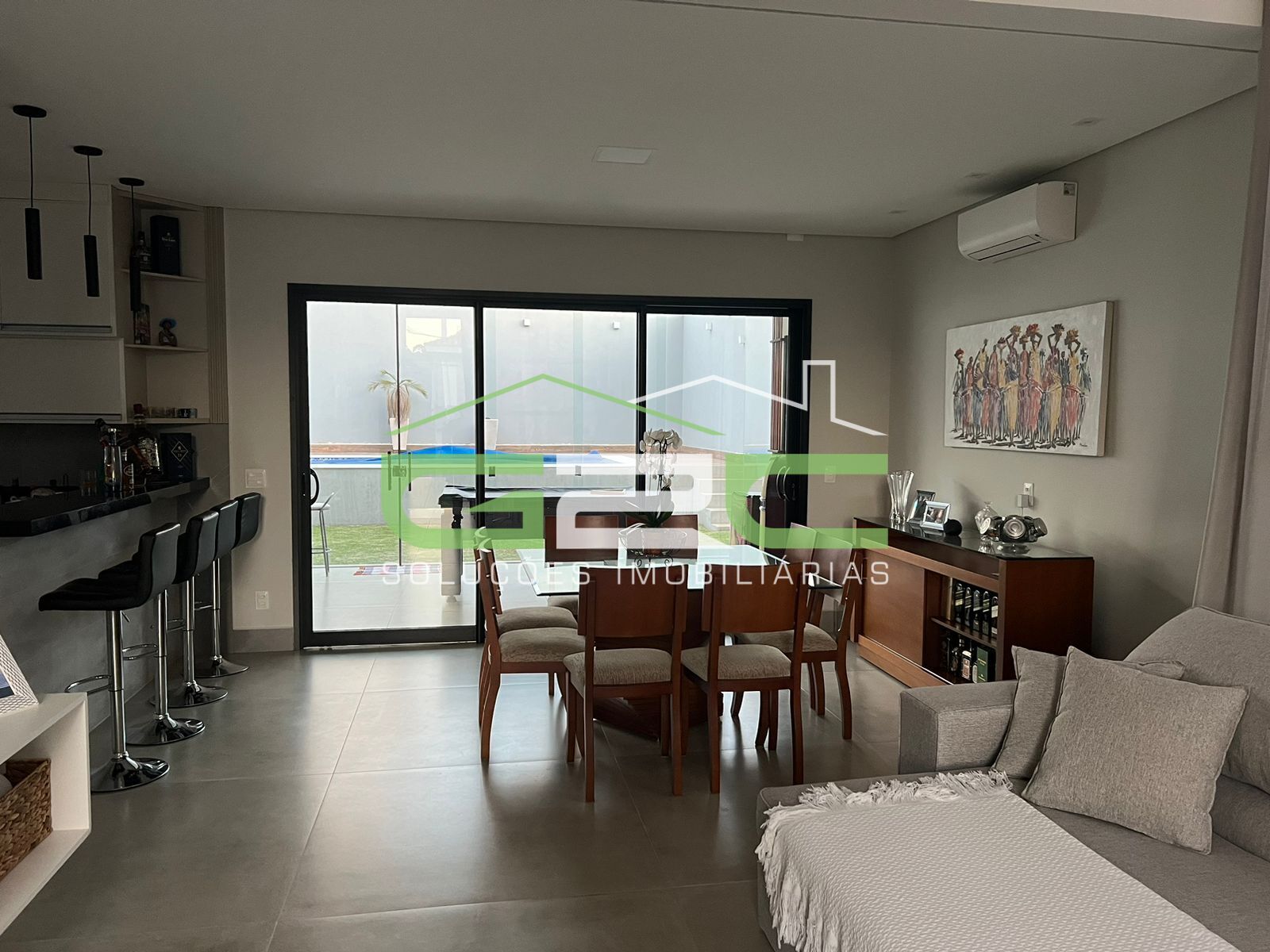 O espaço gourmet está integrado com a casa, porém com fechamento com portas em vidro, gramado, piscina e banheiro exclusivo para piscina.