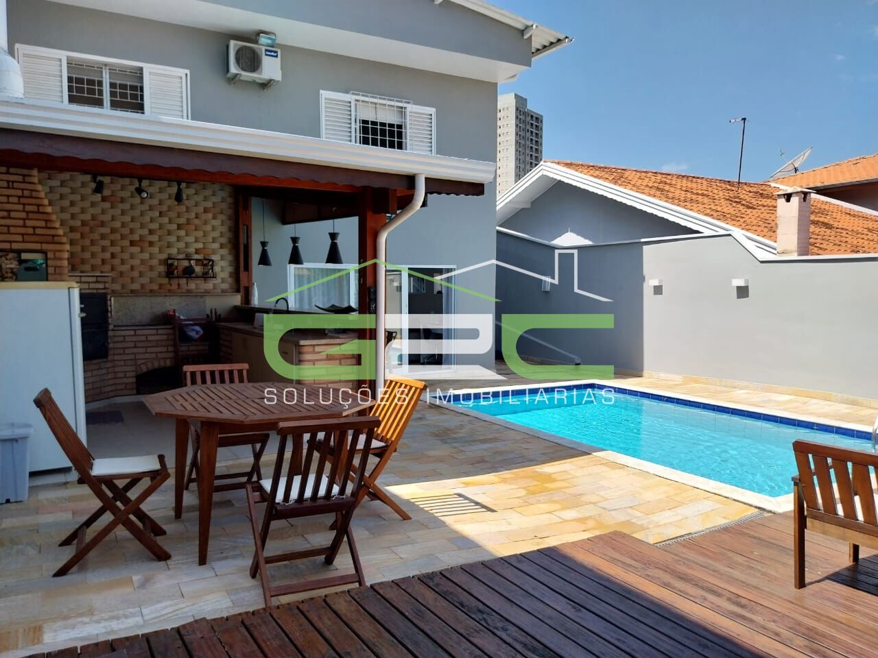A casa ainda conta com uma piscina aquecida e deck em madeira