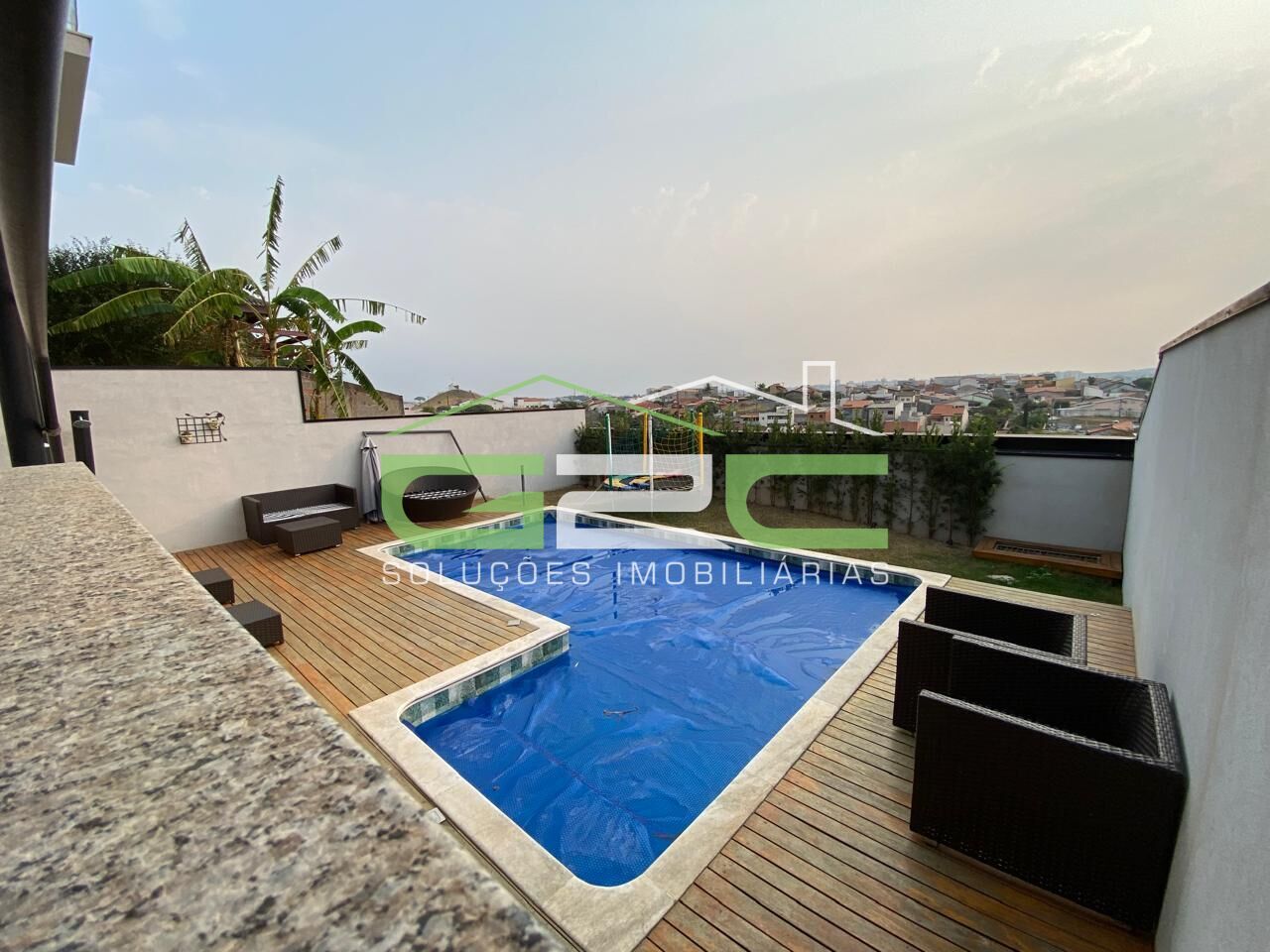 No quintal possui uma piscina aquecida com deck em madeira.